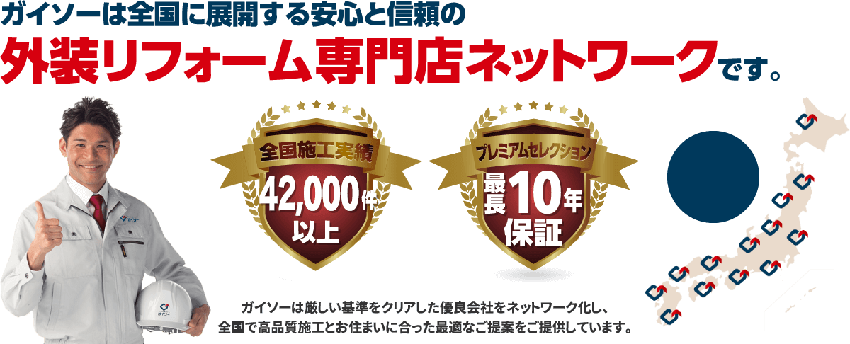 ガイソーでは、厳しい基準をクリアした優良会社をネットワーク化し、高品質な施工を地域の皆様にご提供しています。